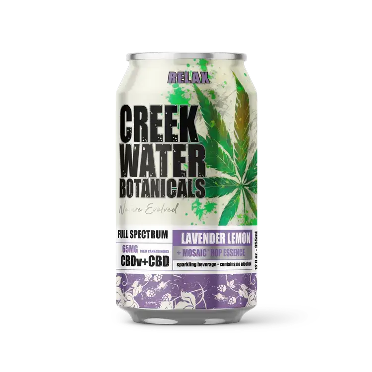 Sparkling Water, CBDv, CBD, Mosaic Hop Essence, Lavender, and Lemon